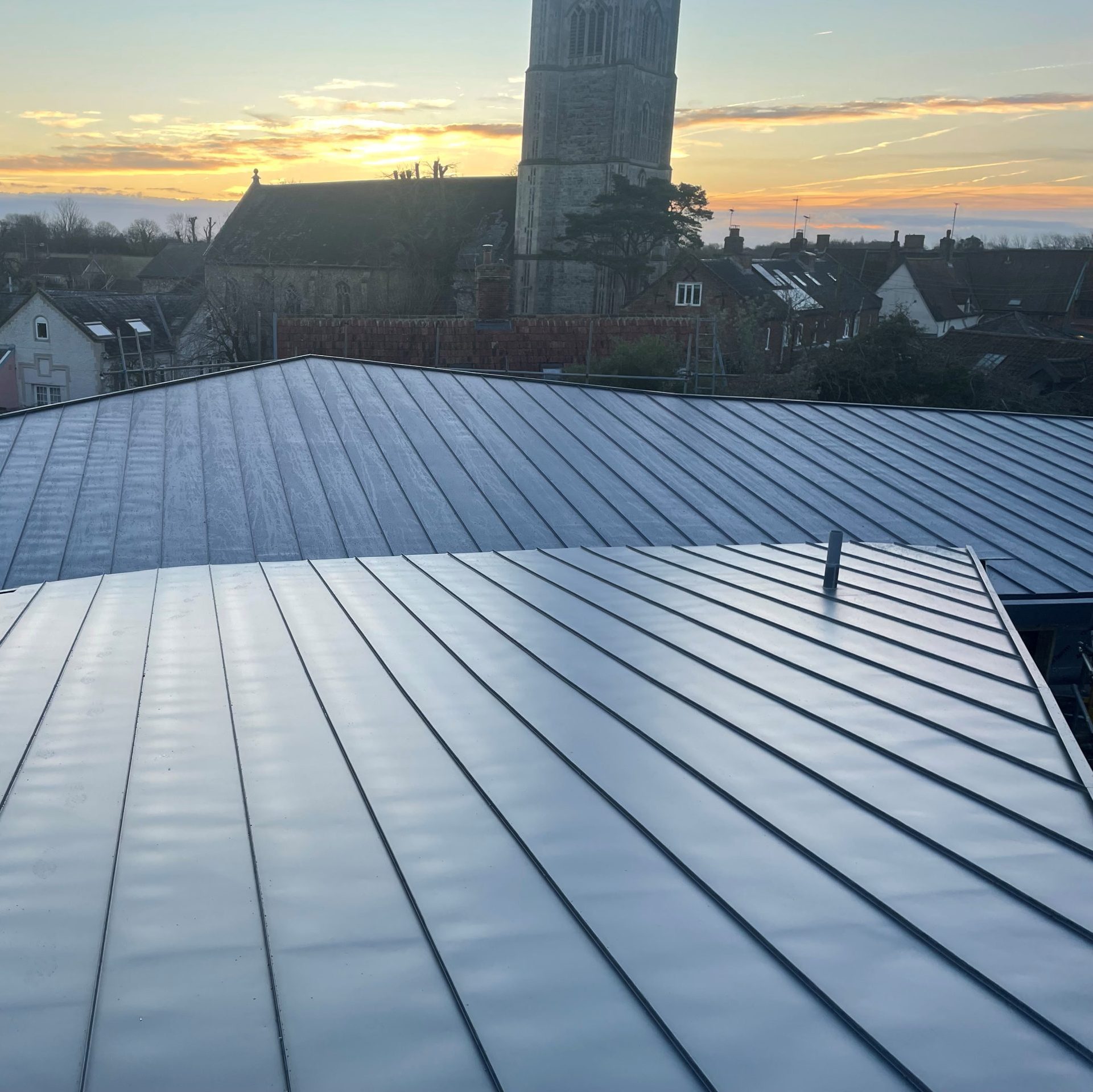 The scope of work encompasses the installation of new standing seam roof coverings and box gutters in Natural Zinc, along with Natural Zinc soffit, fascia, and rainwater goods. A striking mirror-finished stainless feature wall will be integrated, complemented by Pigmento Blue feature walls gracing different areas.